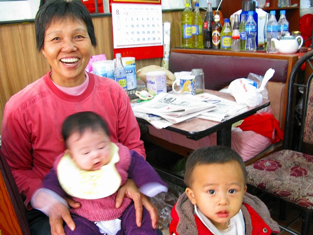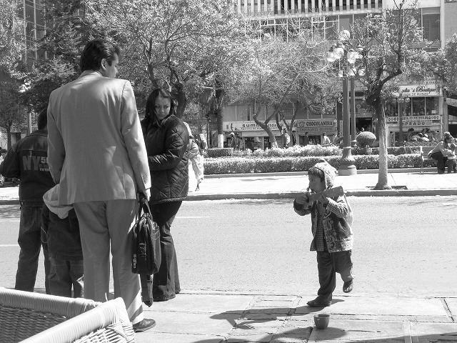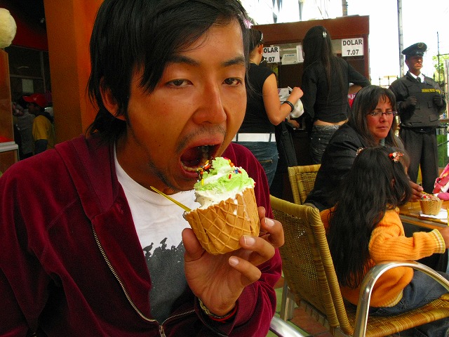 自分はてんこ盛りのトリプルアイスを食べて、前では小さな少年はお金を恵んでもらっている
