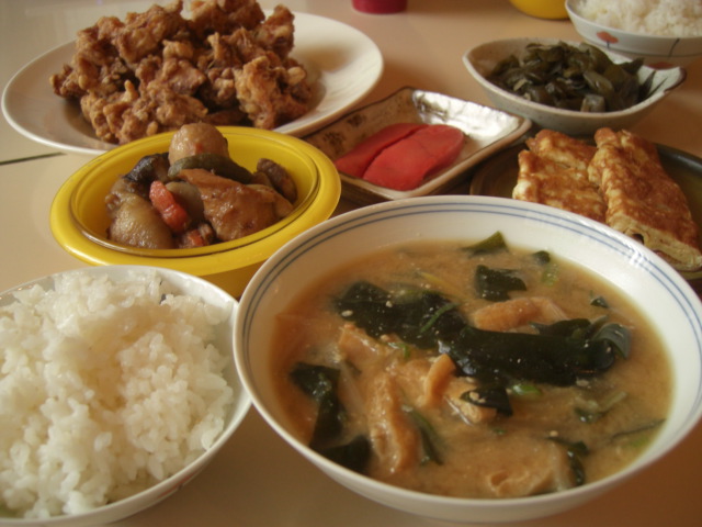 ご飯、から揚げ、筑前煮、味噌汁、明太子、玉子焼き、漬物